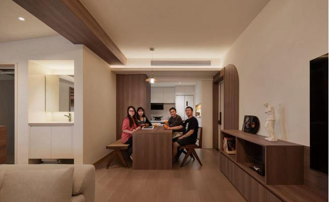 空間以方向作為基本屬性,幾何語言的起點和終點讓視線有所變動。其間的開合、轉折形成空間之間的互動關系,從而影響感知。 設計師以「自然共生」為核心理念,選用天然原木肌理奠定溫潤基調(diào),結合弧形中空天花與流線型穹頂設計,內(nèi)置隱藏式暖光帶,使光線沿曲面自然流淌,營造出“懸浮月光湖”般的詩意光影。局部點綴綠色巖板,冷冽質感與溫潤木紋形成巧妙對比,在碰撞中達成都市與自然的和諧共生,帶來沉浸式的空間體驗。