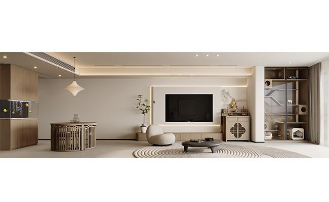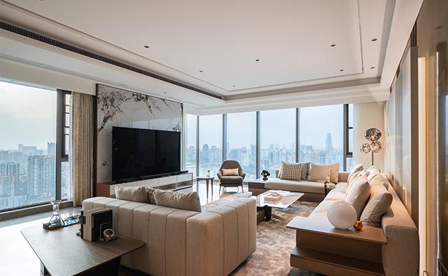 以 “奢雅有度的都市會客廳” 為核心:用米金基底鋪陳溫潤質感,大理石墻與金屬吊燈點綴精致,柔化奢華的銳利感;跳紋單椅與肌理地毯激活空間層次,既保視覺張力又不張揚。開放式餐廚與客區連通,弧形吊頂引光漫入,讓場域在開闊通透中,兼具 “社交的體面” 與 “居家的松弛”,適配都市高階生活的多元需求。