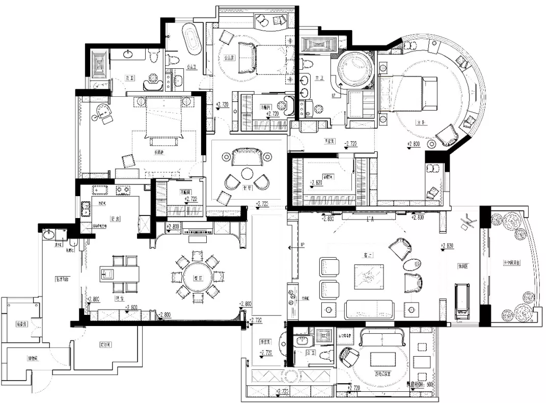 大理石打造出的圓形浴缸區(qū)域是衛(wèi)生間的重頭戲,配以兩個恰到好處的壁龕,營造出奢華與浪漫的氛圍。