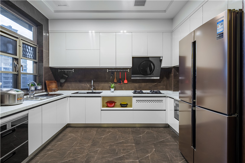 開放式廚房依舊是采用利落的線條,白色與咖色的組合,點綴其間的小綠植,讓廚房充滿了浪漫人文氣息。