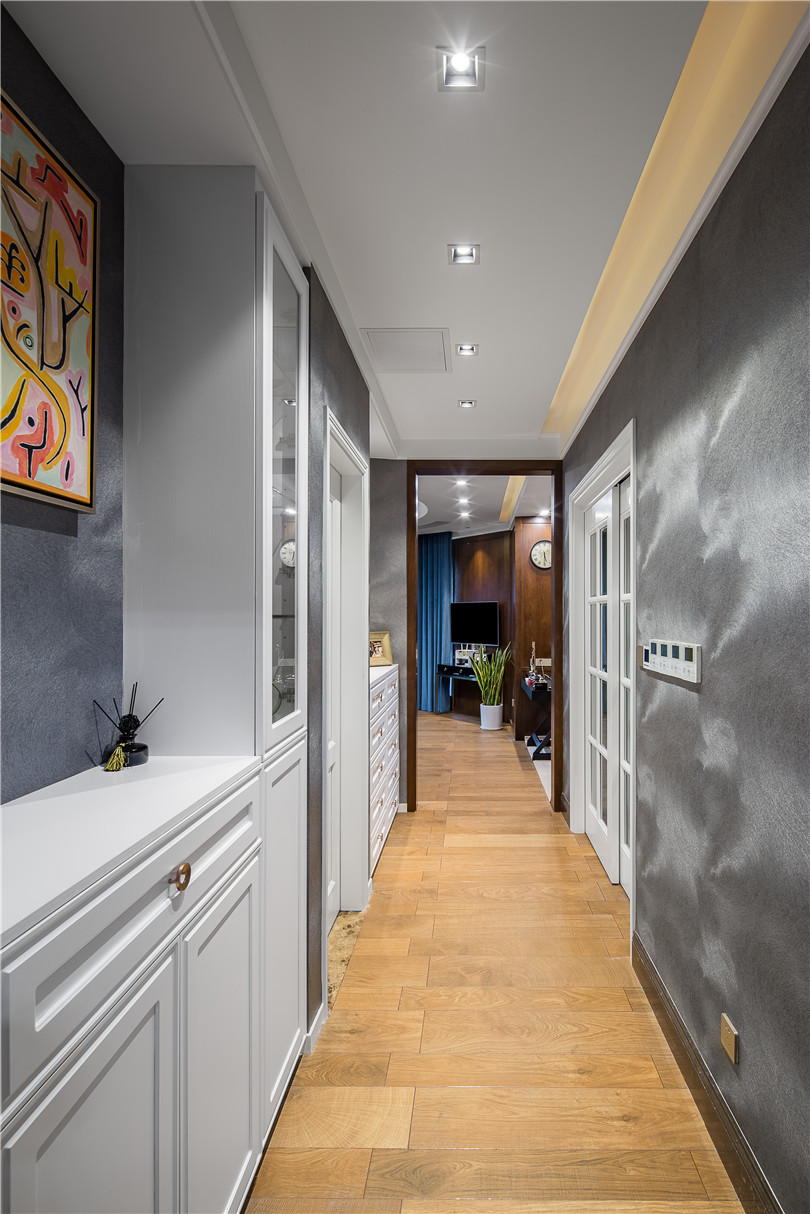 進入主套的走廊采用高級灰帶來更多理性的氣息,配以超現實主義畫家保羅克利的掛畫,更顯示房主不俗的藝術修養(yǎng)。