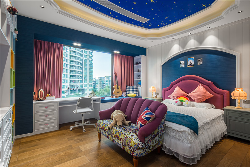 公主房色彩斑瀾構成層次豐富而統(tǒng)一的空間想象,整面墻的飄窗一分為二,打造成出一張書桌和一部分飄窗,功能上更為實用,采光亦是非常好。