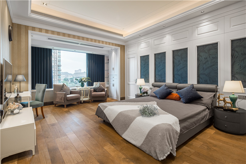 270°落地窗是主臥的亮點,搭配藍色天鵝絨的窗簾,無論白天還是夜晚,這里都時時透露著典雅與時尚。