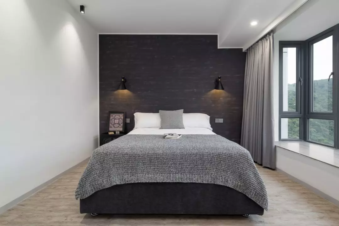 高級灰作為次臥的主調,電子壁爐的新穎床頭柜,滿足功能性同時,營造有溫度、有人情味、有藝術性的生活情境。