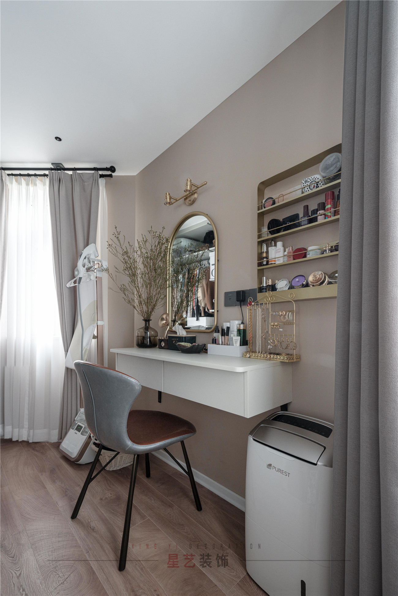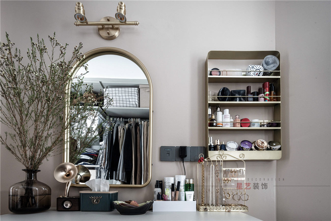 極具北歐風格設計的梳妝臺也是一大亮點,以白墻為底,搭配金色置物架和飾品架顯得高格調還不會太夸張,懸空的白色桌柜也讓業主能使用的更加舒適,看著美觀又節約空間。