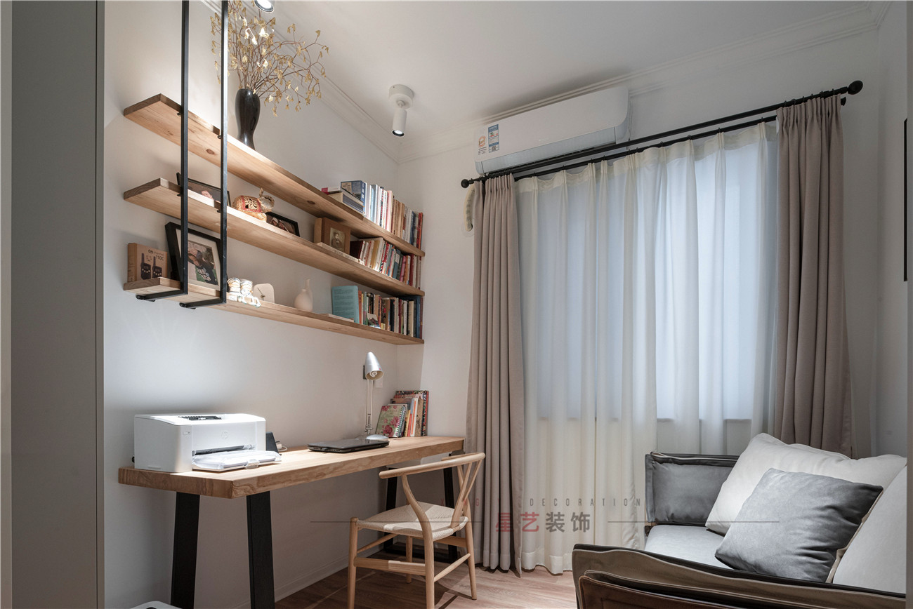 書房屬于下班后得工作區,沒有過多的裝飾,原木色的置物架和復古座椅,樸素簡約,不管是日常的還是孩子學習都能有個舒適安靜的角落,累了還能在沙發上休息片刻,平凡又幸福的生活莫過于此。