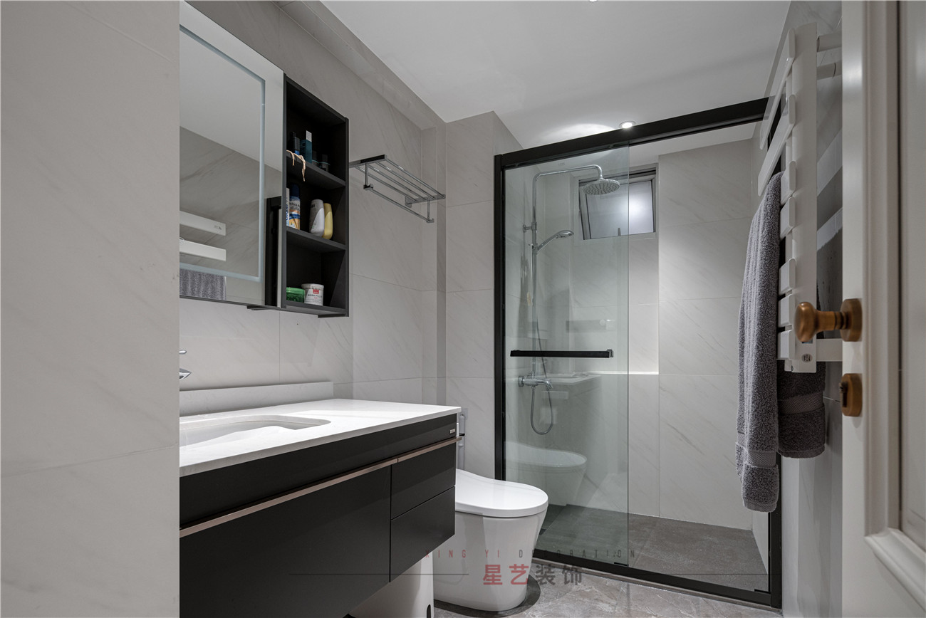 衛生間則是偏向現代風格的簡約設計,整體采用黑白灰的搭配,設置單獨的淋浴區,干濕分離。