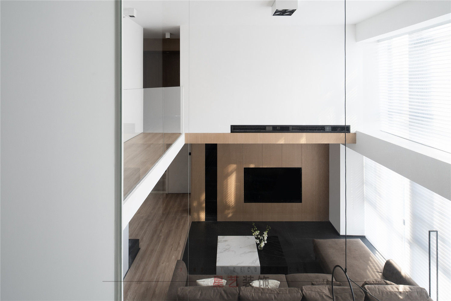 客廳:簡潔的設計,大面積的百葉窗制造極好的光影效果,不管任何天氣都擁有最佳的采光,內嵌的電視機搭配下沉式空間的處理手法帶給業主沉浸的舒適體驗,主色調黑白灰,在各個區域中都有獨立的對應系,精簡而規整,大方而得體。