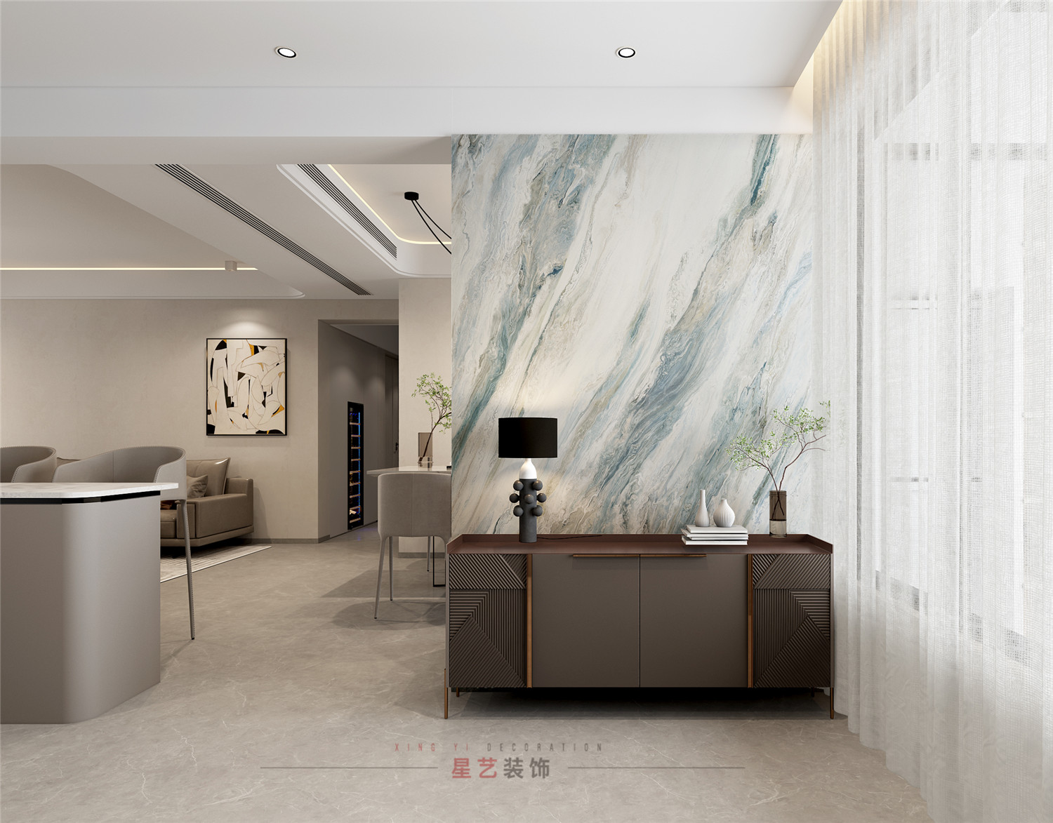 進入玄關(guān),海潮般的大理石紋理映入眼簾, 結(jié)合深咖色亞克力櫥柜,一動一靜恰到好處,日光透過紗簾傾瀉而下,將世界囿于地面,靈動舒揚,捎來生活的囈語。