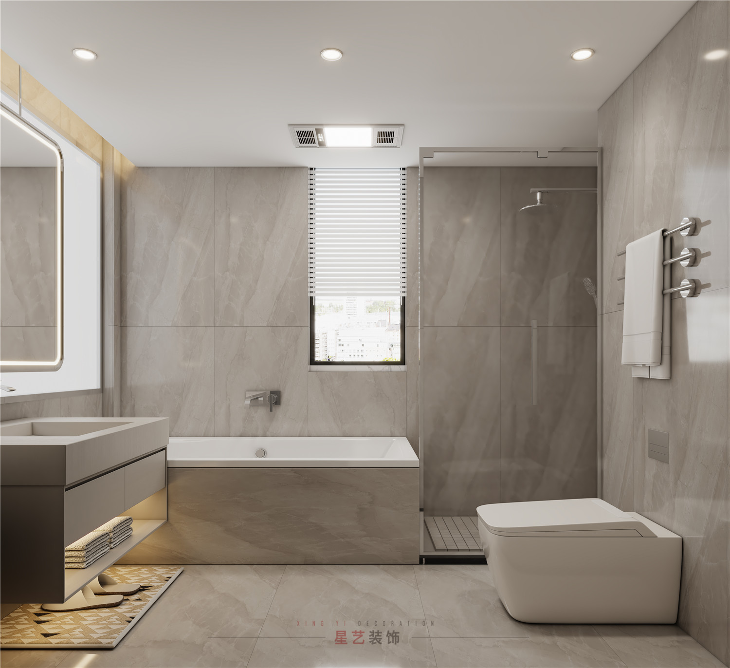 時尚的現(xiàn)代簡約衛(wèi)生間,強調(diào)的是去繁留簡,合理劃分區(qū)域。墻面與地板瓷磚一致,以大理石紋為肌理,干凈大方,柔軟的亮堂潔凈感觸,一直也是呈現(xiàn)時髦簡約的好顏色調(diào)配。