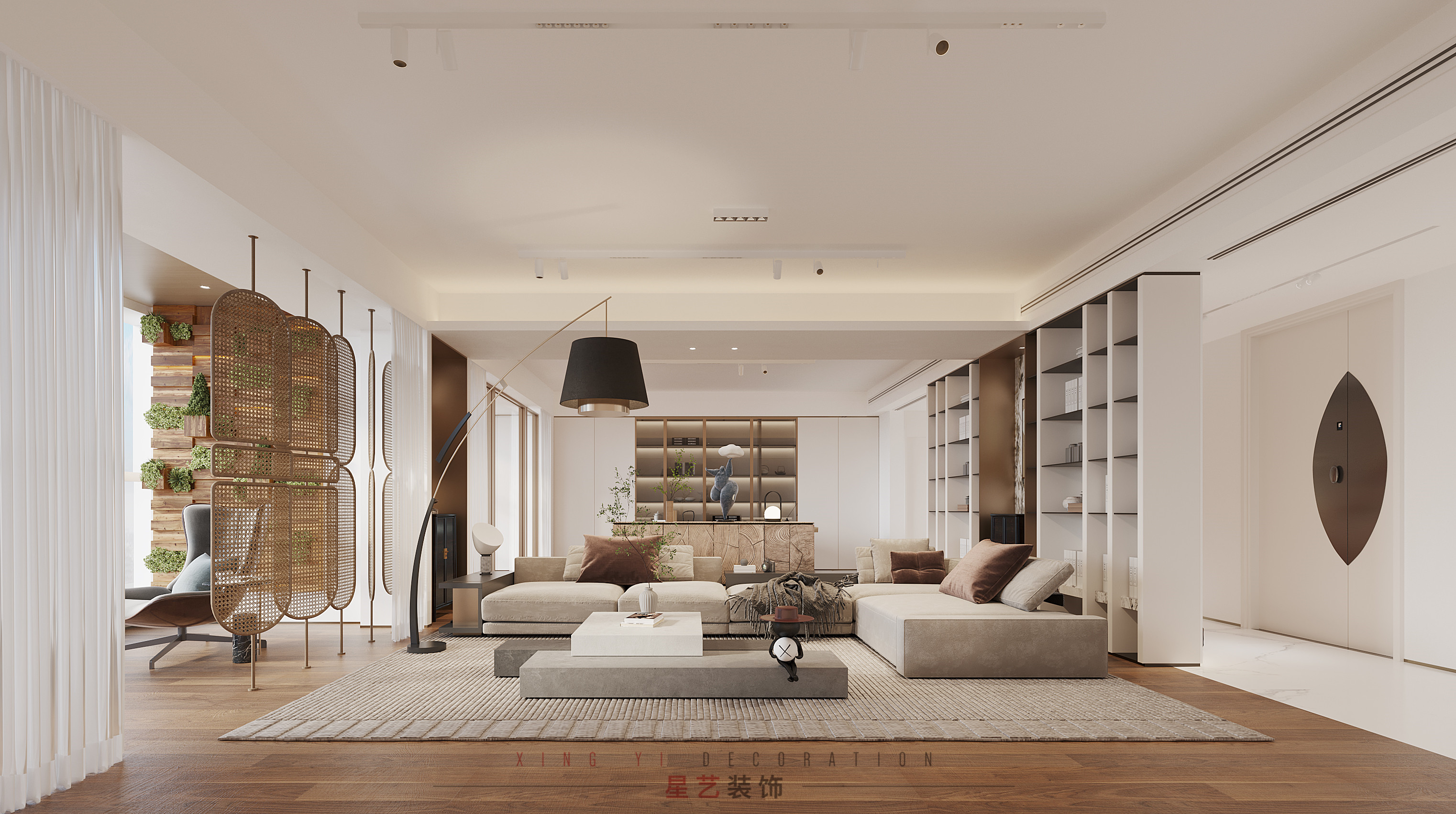 板正的沙發(fā),淺淺的燕麥色,給人以自然的溫暖,左側(cè)是藤編屏風(fēng),自然舒適的感觀,微風(fēng)徐來之時(shí),宛若置身東南亞。