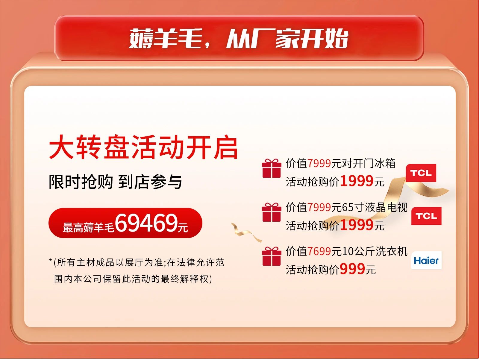 好飾連城活動期間,特惠享不停!到店參與大轉(zhuǎn)盤活動,限時搶購家電出廠價!先到先得~